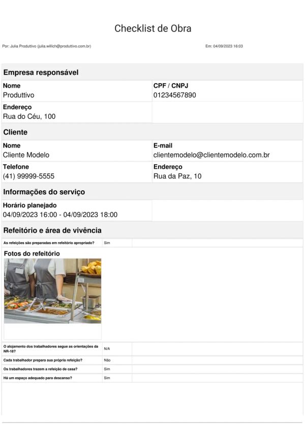 Modelo digital de check list de obra com questões de conformidade para acompanhamento geral da obra, fotos tiradas na hora com marcação de data e horário, assinatura digital e recursos que agilizam o preenchimento. Experimente e personalize grátis!