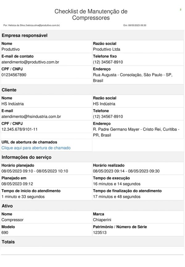 Controle os serviços através do checklist de manutenção de compressores digital. Cálculo automático de peças, materiais e serviços; questões de conformidade e registros fotográficos anexados diretamente no relatório final. Experimente!