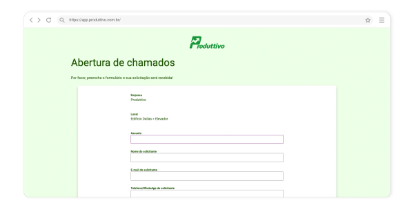 Página personalizada para solicitação dos clientes, que pode ser através de um link para a página de chamados ou pelo QR Code instalado nos ativos.