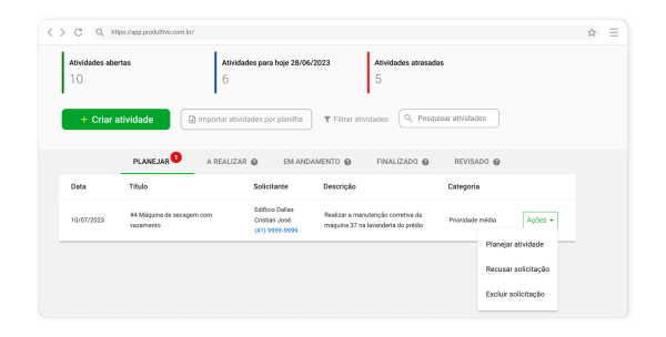 Os gestores têm acesso a um painel com uma visão geral sobre a operação, podendo acompanhar toda a rotina da equipe, como atividades atrasadas, em andamento, finalizadas e novas solicitações.
